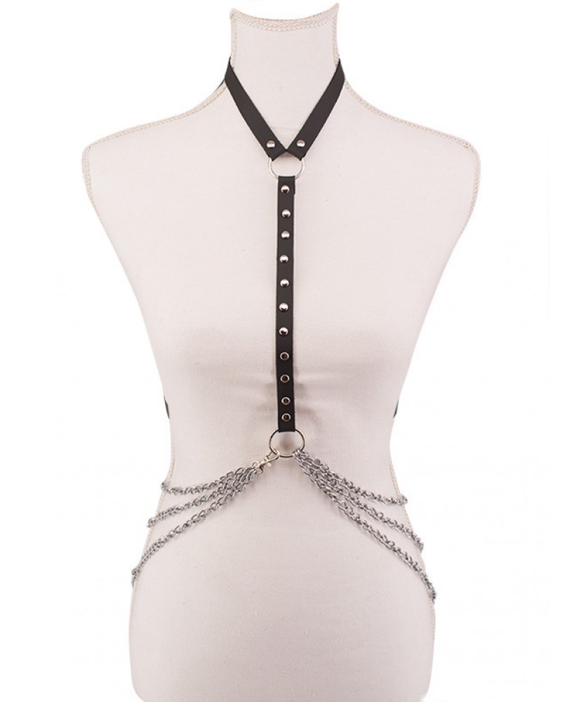 Accesoriu din piele naturala pentru corp cu lant atasat.